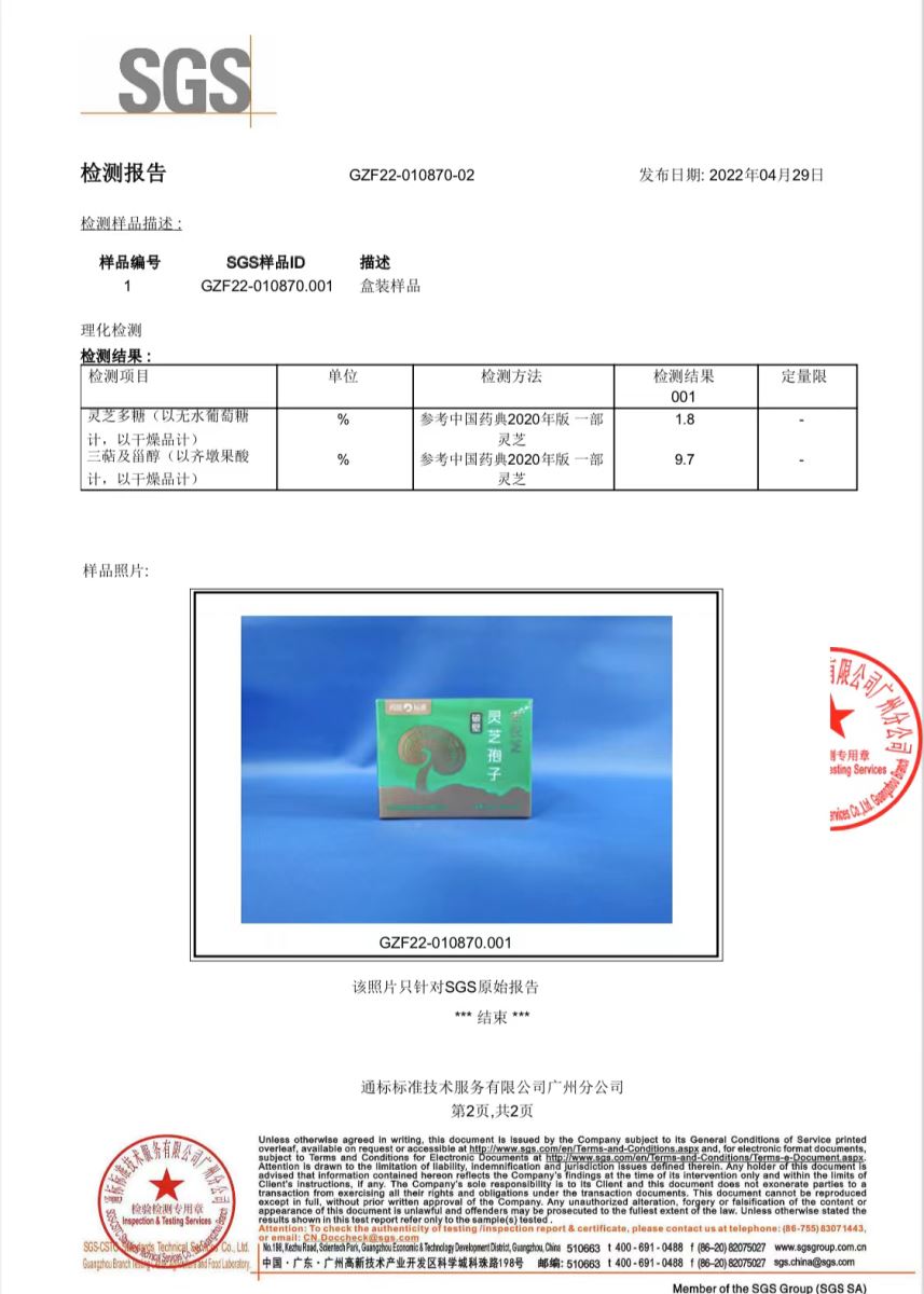 其中,灵芝多糖含量分别为1.68%、1.8%、三萜及甾醇含量分别为9.7%、11.3%。据此结果,老农芝有理由说,灵芝孢子粉,您可以永远相信老农芝!